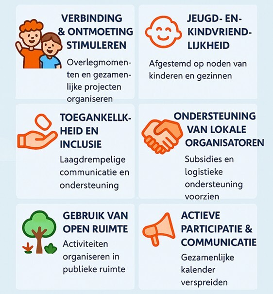Kortemark neemt het voortouw in het organiseren van het samenwerkingsverband en ondersteunt lokale actoren bij het uitbouwen van hun aanbod. We voorzien een subsidiebeleid en bieden begeleiding om kwaliteit en duurzaamheid te garanderen. Op die manier versterken we het lokale netwerk en geven we organisatoren de ruimte om te groeien.